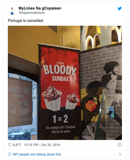 As Halloween approached, the company decided to launch a campaign in Portugal promoting their “Sundae Bloody Sundae”, not realizing the implications the phrase has had in history. the phrase is associated with the 1972 shooting when British soldier shot 14 unarmed Northern Ireland civilians during a protest against the internment of suspected members of the Irish Republican Army. In retrospect, the play on words for the sundae would have been great if it weren’t for the cruel association.