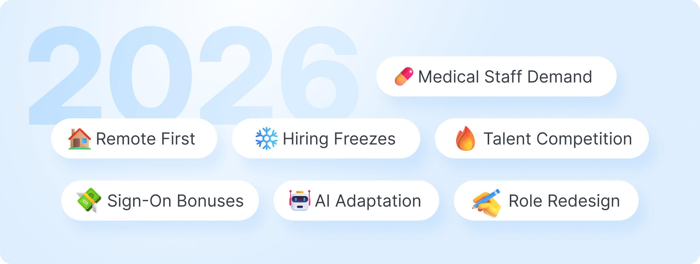 Escalating healthcare talent shortage. Medical facilities face mounting pressure to offer larger sign-on bonuses and highly flexible shifts to attract professionals. Healthcare appears positioned to remain the only sector showing steady growth while other industries stagnate.