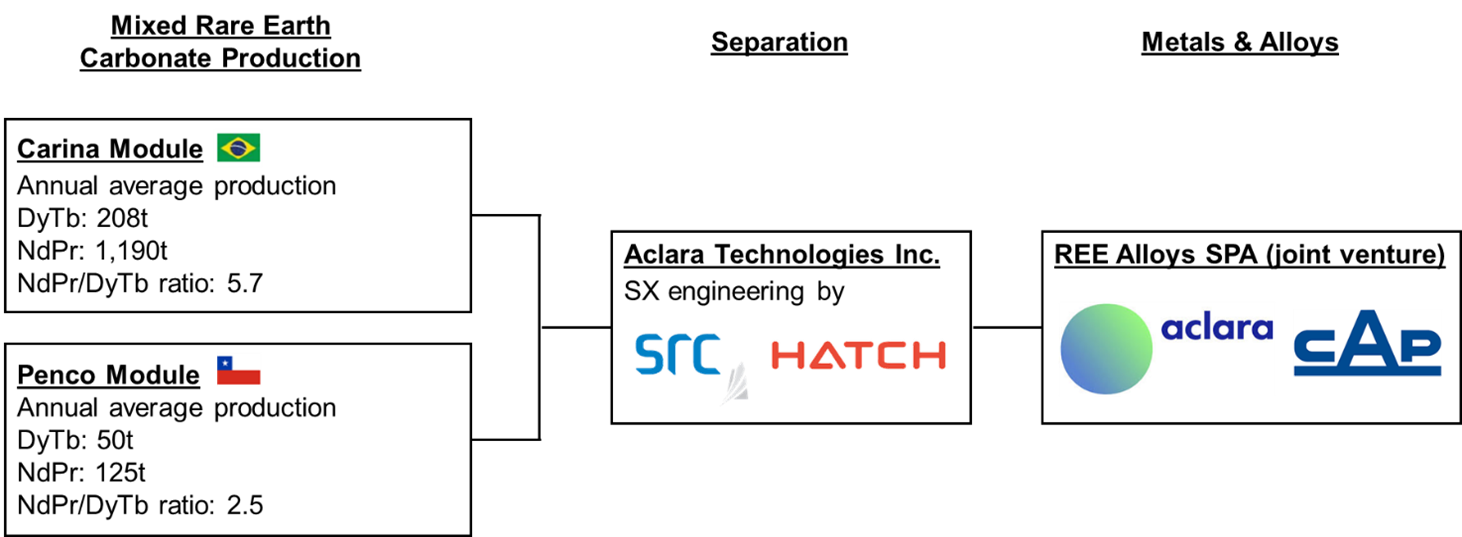 Aclara Technologies is expected to source high purity mixed rare earths carbonates from Aclara's extraction modules in Chile and Brazil. These carbonates subsequently will be converted into individual rare earths oxides in the separation facility. For this purpose, Aclara Technologies has engaged the Saskatchewan Research Council ("SRC") to develop a production flowsheet specially designed for its premium carbonate, and Hatch Ltd. ("Hatch") to work on the engineering of the proposed separation facility. Under the terms of the agreement, SRC will develop a conceptual Solvent Extraction ("SX") separation process, which will serve as the basis for Hatch to conduct a Class 5-AACE CAPEX and OPEX estimation for the rare earth separation facility. The objective of this conceptual analysis is to design a plant capable of processing Aclara's mixed rare earth carbonates into separated neodymium and praseodymium (NdPr) oxide (with a purity of 99.0-99.9% by weight) and dysprosium (Dy) and terbium (Tb) oxides (with a purity of 99.5-99.99% by weight). The engineering study is expected to be completed by the end of the third quarter of 2024.