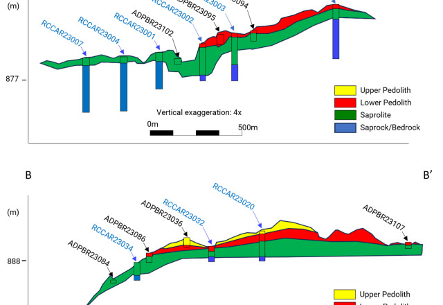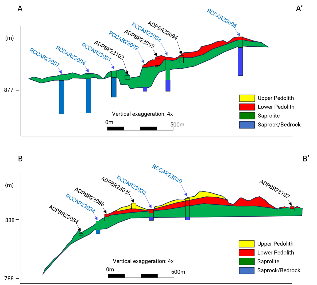 Figure 3 depicts the regolith horizons across two cross-sections, A-A' and B-B'. Here, the saprolite is better defined and thicker, and demonstrates greater continuity than the results observed during the previous auger drilling campaign. The auger holes are annotated in black font, whereas the RC drill holes are annotated in blue font.