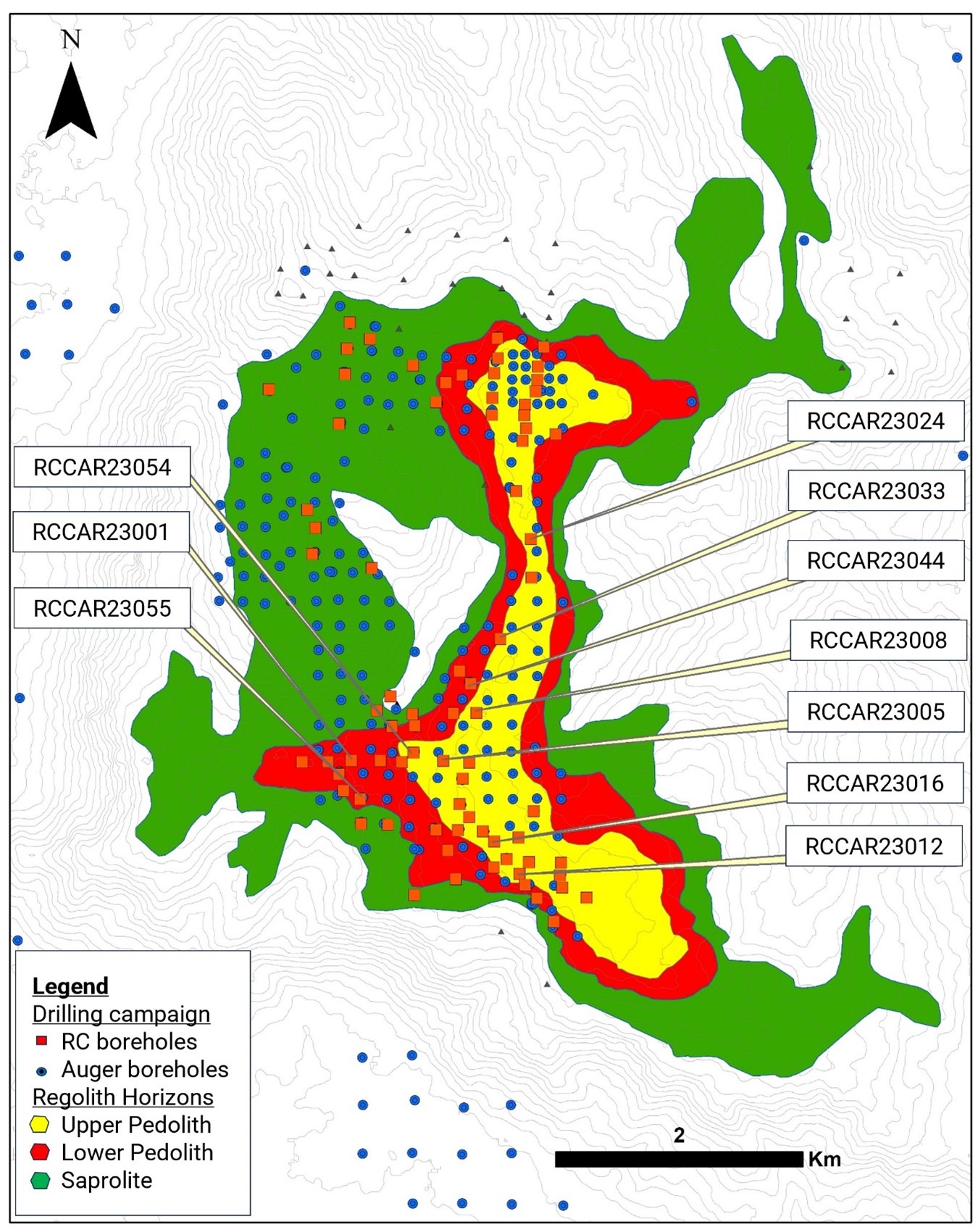 Figure 2 depicts the extensions of the upper pedolith, lower pedolith, and saprolite units, which define the mineralization overprint of the regolith-hosted ion-adsorption clay deposit. Figure 2 also demonstrates the collar locations of the previous auger drilling campaign and the Phase 1 RC drilling campaign.