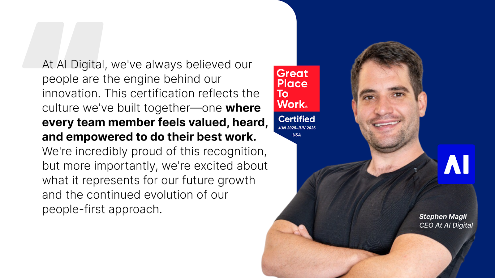 "At AI Digital, we've always believed our people are the engine behind our innovation," said Stephen Magli, CEO of AI Digital. "This certification reflects the culture we've built together-one where every team member feels valued, heard, and empowered to do their best work. We're incredibly proud of this recognition, but more importantly, we're excited about what it represents for our future growth and the continued evolution of our people-first approach."