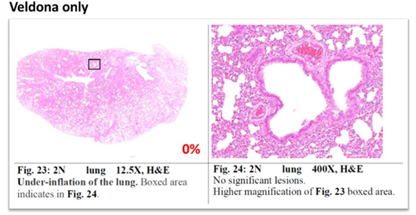 For pathological indicators, on the tenth day, no hamsters in the VELDONA® Group showed mixed-cellular inflammation, peribronchial infiltration, and perivascular infiltration, compared to 50% of hamsters in the Placebo Group. Hamsters in the VELDONA® Group in general showed promising results in treating indicators of new variant virus infection.