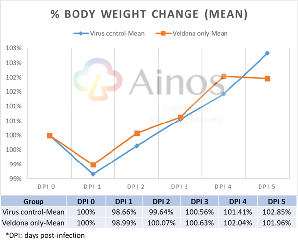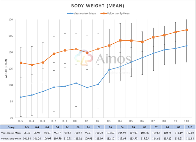 The Study evaluated the effectiveness of VELDONA® over a sixteen-day course (five-day pre-treatment, one-day during viral infection and ten-day treatment after infection) of Omicron-variant-infected hamsters. Compared with hamsters in the placebo group receiving solution without VELDONA® (the "Placebo Group"), the hamsters in the group receiving solution with VELDONA® (the "VELDONA® Group") demonstrated resistance to body weight loss immediately after infection, then showed a better recovery trend in the following three days. The body weights of the hamsters in the VELDONA® Group remained more stable than those of the hamsters in the Placebo Group during the treatment period.