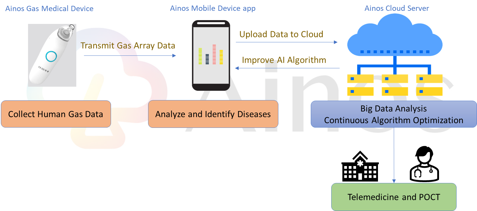 The future of healthcare lies in the integration of AI-enabled medical devices, telehealth services, and cloud applications. Ainos' medical devices generate significant amounts of data during the testing process (see Figure 2), and big data analysis of this information constantly renders algorithms more accurate. Meanwhile, long-term monitoring of individual health data in combination with these algorithms and cloud databases will help detect diseases early on and aid in their prevention. As a result, patients will be able to achieve a level of precision health that has historically been impossible.