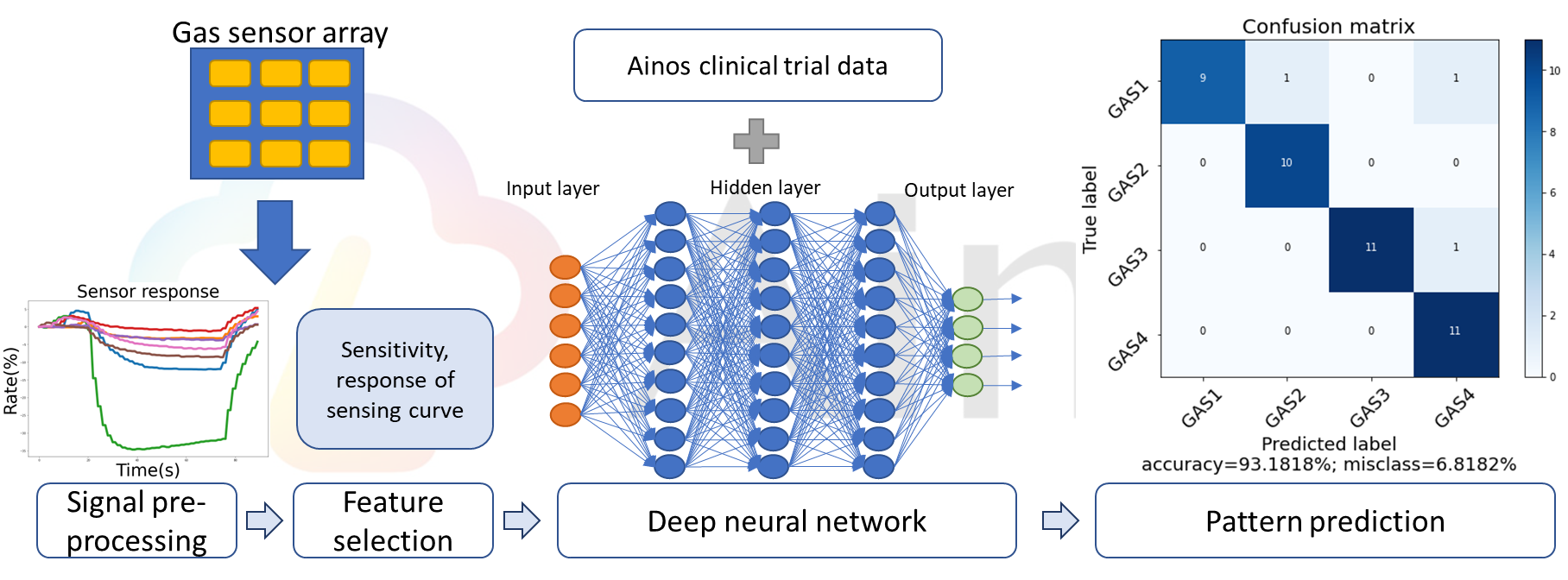 Ainos' AI Nose consists of an array of digital nose sensors, which are primarily used to detect volatile organic compounds (VOCs). The VOC signals collected by these sensors undergo pre-processing, followed by feature selection extracting data on each signal's unique characteristics. Leveraging deep neural networks, clinical trial data labeling, and supervised machine learning, Ainos' AI Nose can accurately identify VOC samples.