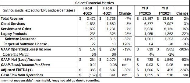 (1) The Company's fourth quarter fiscal year 2025 results include a non-cash tax expense of $0.3 million, resulting from the differences between the Company's income tax rate and the statutory rate while the Company's fourth quarter fiscal year 2024 results include a non-cash tax benefit of approximately $1.9 million, primarily due to the release of the valuation allowance for deferred tax assets.