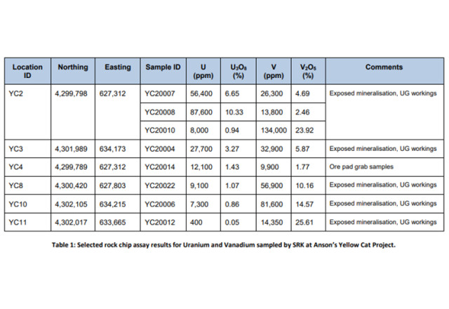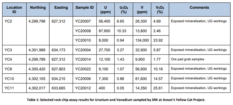 This drilling program located on the eastern block of the project area is along strike of the historical mineral resource, see ASX Announcement 4 February 2026, that was sourced from USGS reports*. The mineralisation is shallow or comes to the surface and as a result, the mineralised horizon is located above the water table which will result in shallow drilling and minimal disturbance. The Eastern claim block of the project contains a well-defined east-west striking zone of uranium and vanadium mineralisation at excellent grades. Table 1 shows a selection of the sample results collected during Anson's previous exploration programs. Anson plans to drill the mineralised trend from the Windy Point and McCoy Group to the Cactus Rat and Mineral Treasure mines. Drill depths will range from 12m to 40m. Diamond coring of some mineralized zones would allow both assaying for uranium, vanadium and associated minerals and metallurgical studies such as density interpretations that can be used in mineral resource calculations.