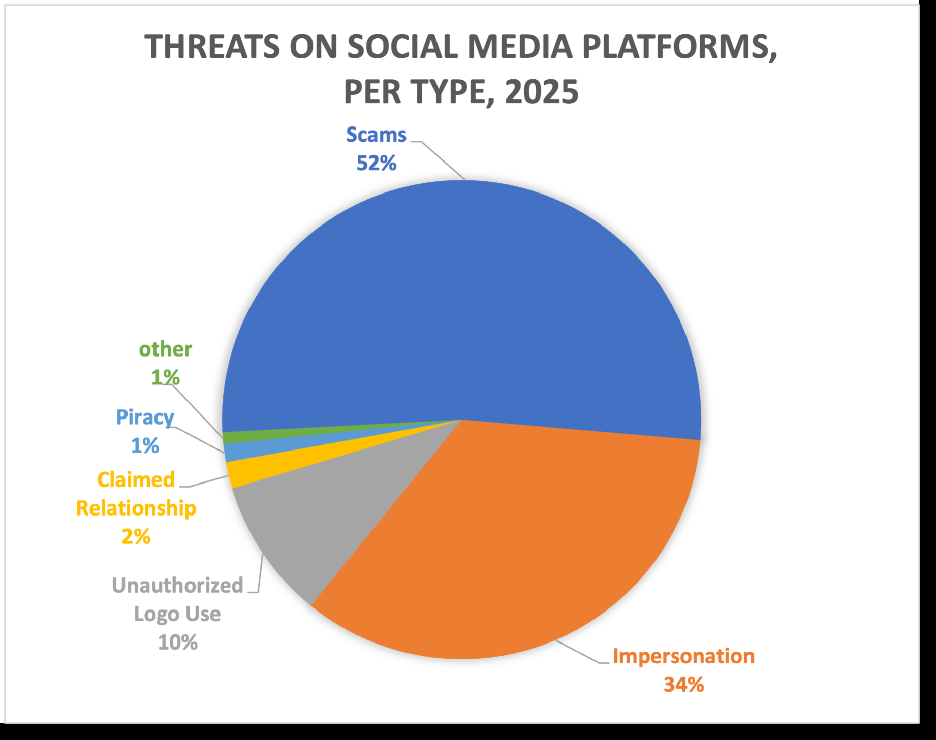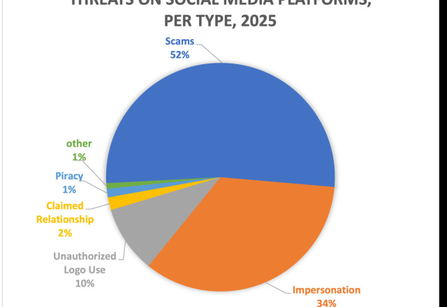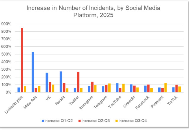However, during 2025 the volume of scams and fraud increased on every social media platform, according to APWG contributing member ZeroFox. Volume also increased across threat types every quarter last year. The volume of scams, phishing, impersonation attacks, and other threats grew from 51 percent up to 843 percent from quarter to quarter.