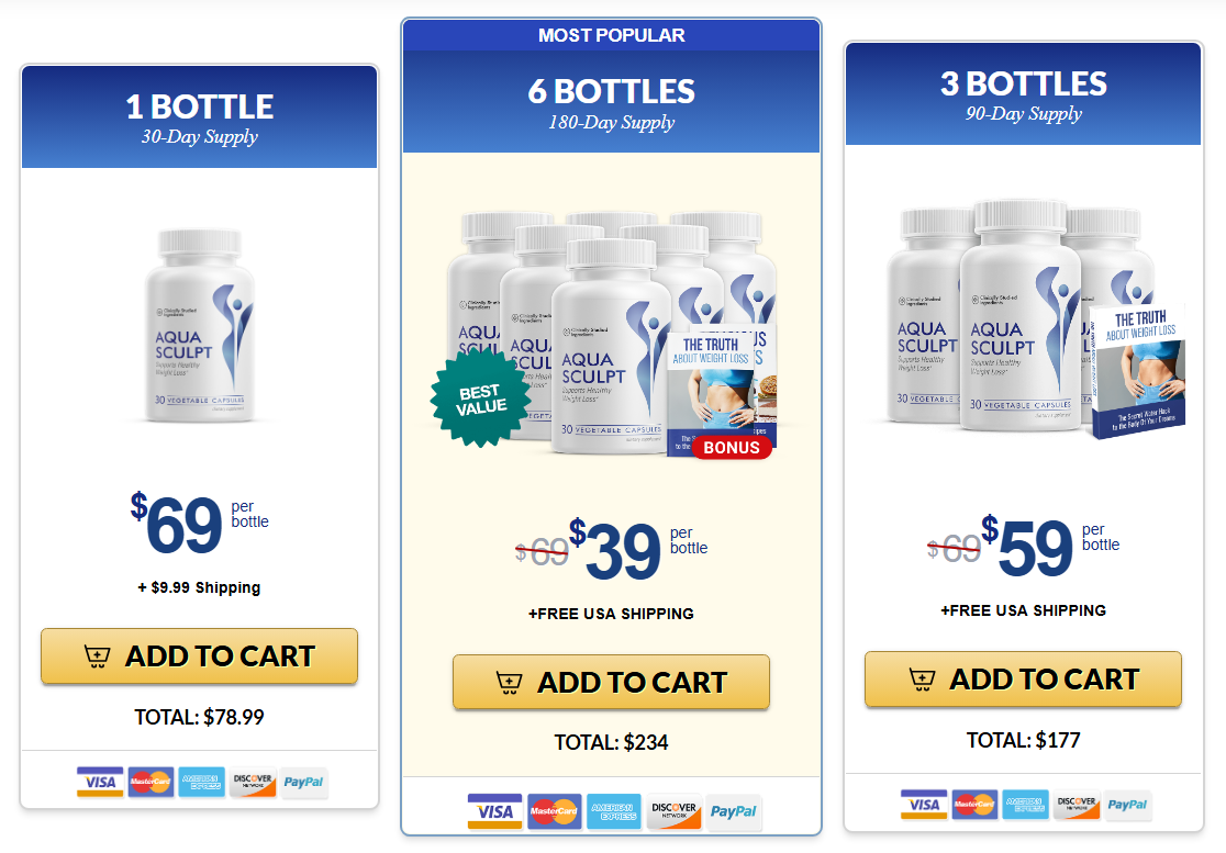 As of early 2025, AquaSculpt pricing follows a tiered model designed to reward consistency. The most popular option among verified buyers is the three-bottle bundle, providing a full 60-day cycle, the same period used in AquaSculpt's internal clinical evaluation and refund guarantee. Buying from the official website unlocks automatic discounts and free U.S. shipping, with savings reaching up to 75% off during rotating promotions.
