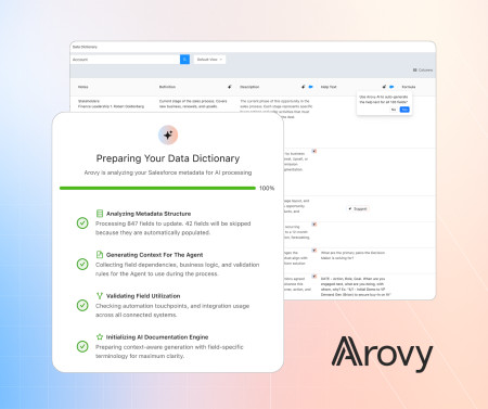 The Arovy Data Dictionary now features Bulk AI Documentation and a new API, helping teams turn Salesforce metadata into a trusted foundation for analytics, automation, and AI.