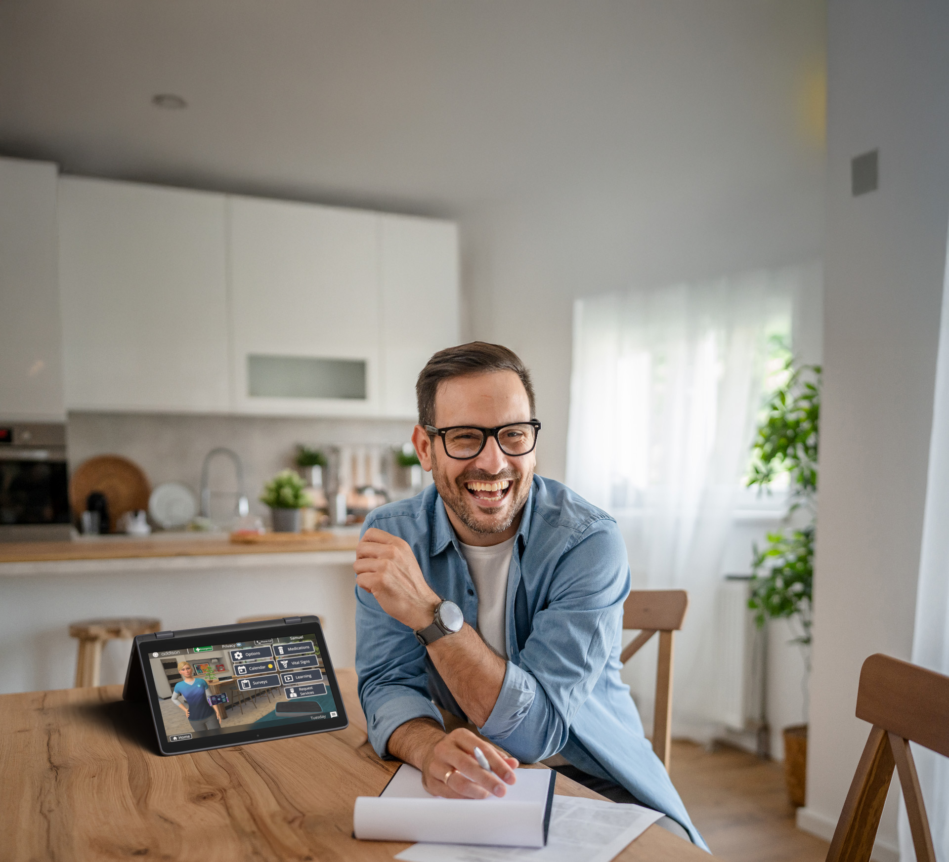 Addison is a 3D, interactive virtual care assistant that lives on a dedicated screen in the home and on mobile devices. Patients see and speak with Addison as if they're talking to a person, while a 24/7 TeleCare team stands behind the experience to monitor risk, coach, and intervene when needed.