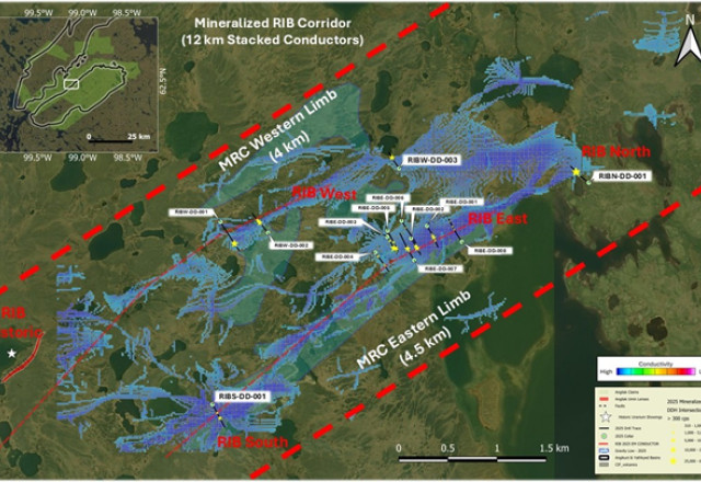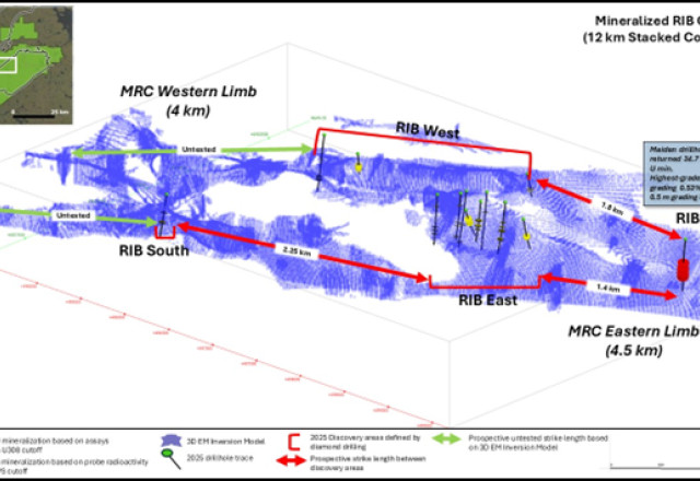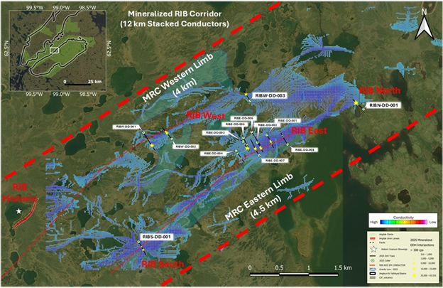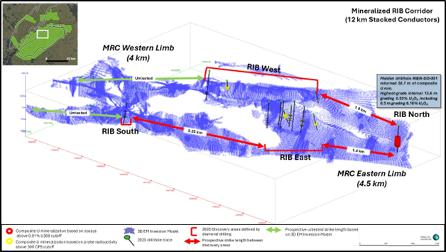 RIB North Discovery is situated along the 4.4 km eastern limb of the Mineralized RIB Corridor ("MRC") - a 12 km trend containing stacked structural anomalies, identified using 3D EM Inversion modeling. During the 2025 Angilak Exploration Program these anomalies were drill tested, resulting in a 100% success rate of intersecting uranium mineralization, and the discovery of four new mineralized areas: RIB East, West, North and South (Figures 2 & 3);