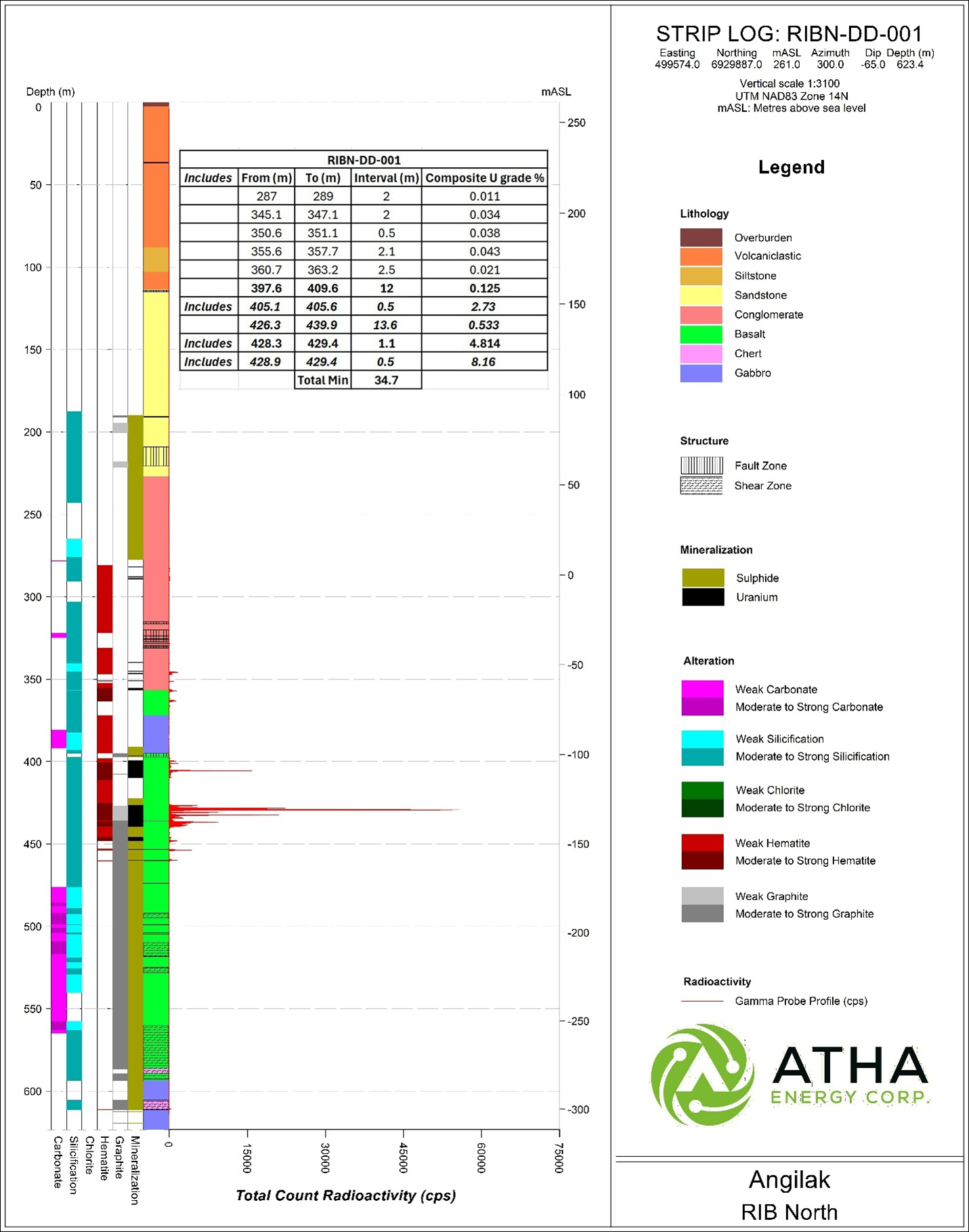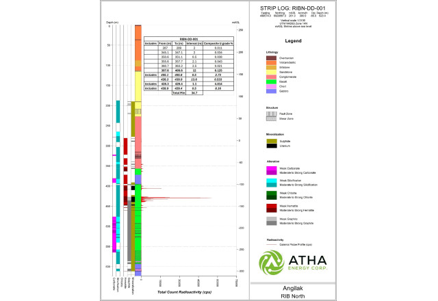 VANCOUVER, BC / ACCESS Newswire / November 20, 2025 /ATHA Energy Corp. (TSXV:SASK)(FRA:X5U)(OTCQB:SASKF) ("ATHA" or the "Company"), is pleased to announce assay results from the maiden drillhole at the RIB North Discovery, completed as part of the 2025 Angilak Exploration Program at its 100%-owned Angilak Uranium Project in Nunavut, Canada. Assay results from RIBN-DD-001 represent the best exploration hole to date at the Angilak Project, intersecting a total of 34.7 m of composite uranium mineralization1 over seven zones, from 287 m to 439.9 m depth. The highest grade and widest continuous interval of mineralization was intersected from 426.3 to 439.9 m depth, grading 0.53% U3O8 including 8.16% U3O8 over 0.5 m (Figure 4).