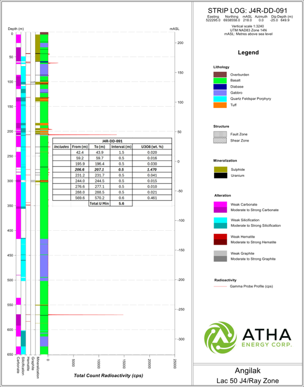 Figure 7: Striplog J4R-DD-091 showing mineralized interval with composite uranium mineralization1 with average grades - derived from assay samples.
