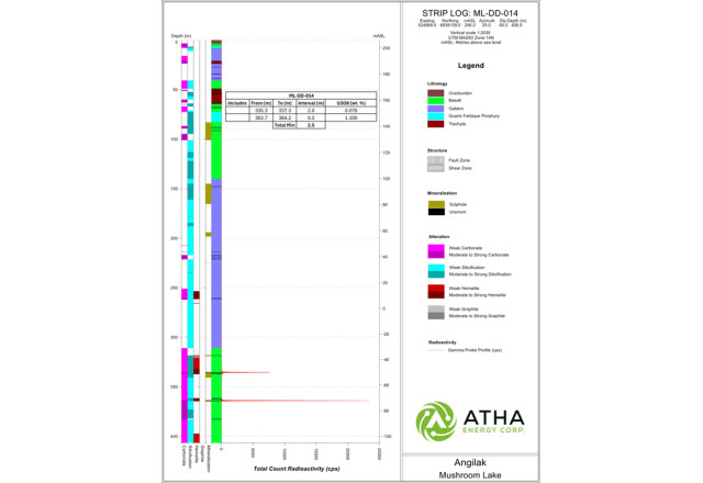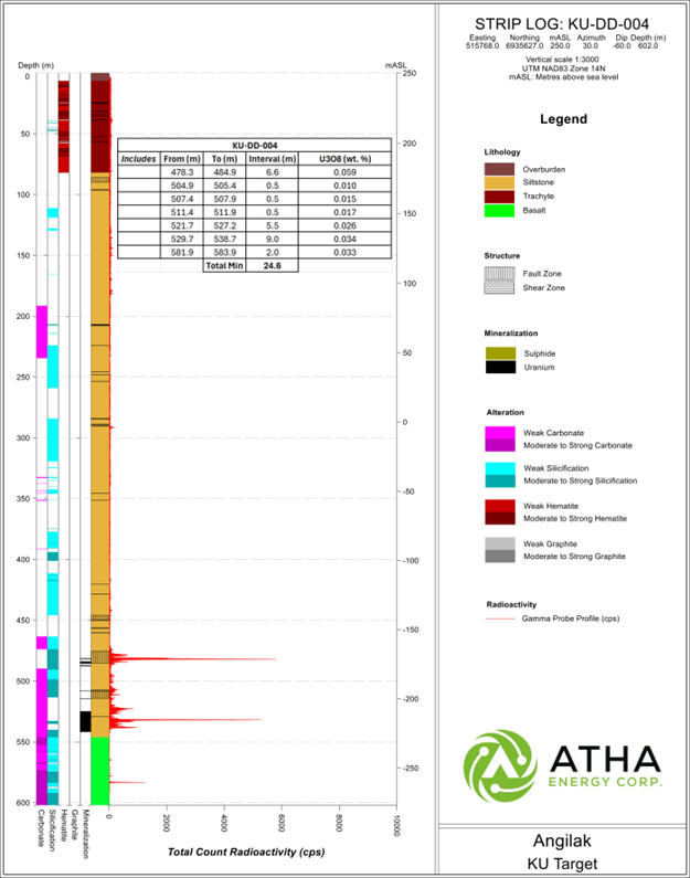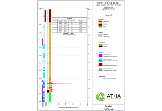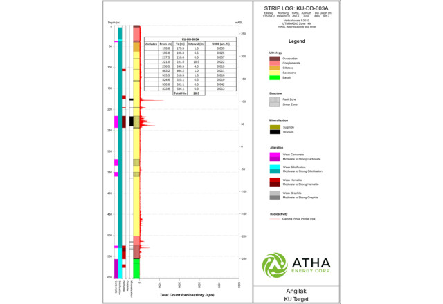 Detailed lithologic striplogs, including assay results tables, for all nine drillholes can viewed in the Supplementary Release on ATHA Energy's website (Striplog Data).