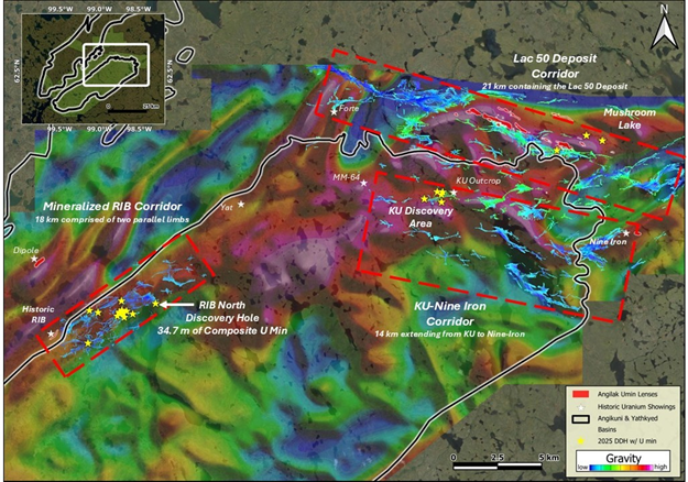 1. Lac 50 Deposit Corridor: Located just outside the northern margin of the Angikuni Basin, the corridor is 21 km long, hosts the Lac 50 Deposit and remains open and unconstrained with numerous additional uranium showings. Drilling in 2025 focused on expansion of the mineralization envelope beyond the Exploration Target area, as well as discovery of mineralization at depth below the 3 km long Mushroom Lake mineralized outcrop.