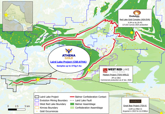 Figure 1: Map of Red Lake Gold District, showing Athena's Laird Lake project and nearby deposits. Mineralization on nearby or adjacent projects is not necessarily indicative of mineralization at Laird Lake.