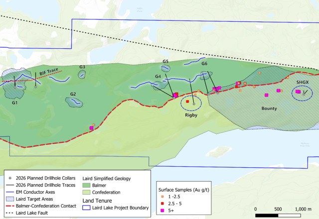 Figure 2: Plan map showing proposed drilling at Laird Lake.