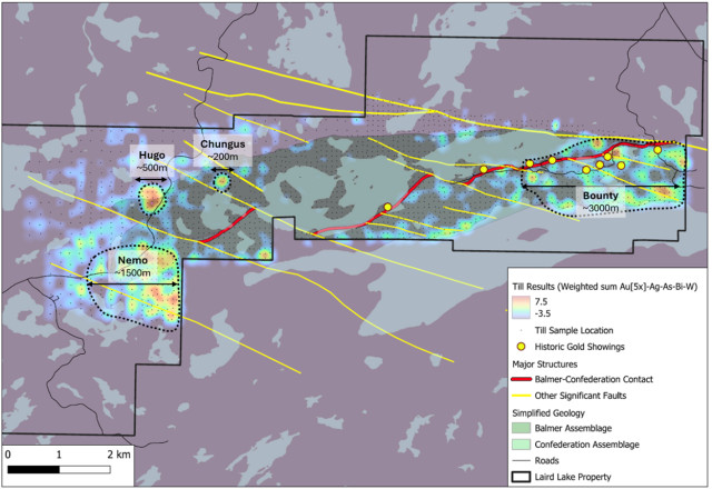 Figure 1: 2025 Till results displaying a weighted sum of Au[x5]-Ag-As-Bi-W calculated using a log transform. Structures include the Balmer - Confederation assemblage which is a primary control on gold distribution in the Red Lake district, along with a series of cross-cutting Laird Lake fault sets which are interpreted to a local control on mineralization.