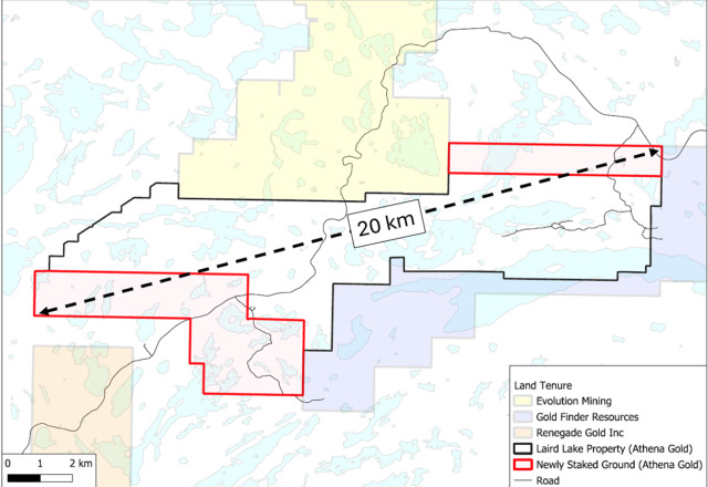 Athena has materially increased its Laird Lake project through map staking to 7,457 hectares from 5,155 hectares, with the project now spanning ~20 km of prospective ground.