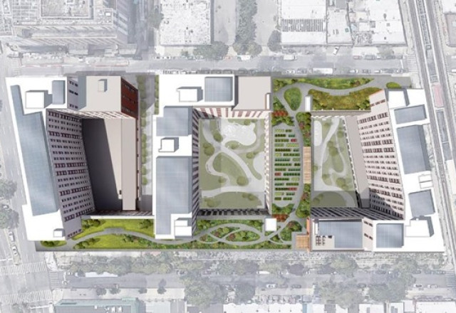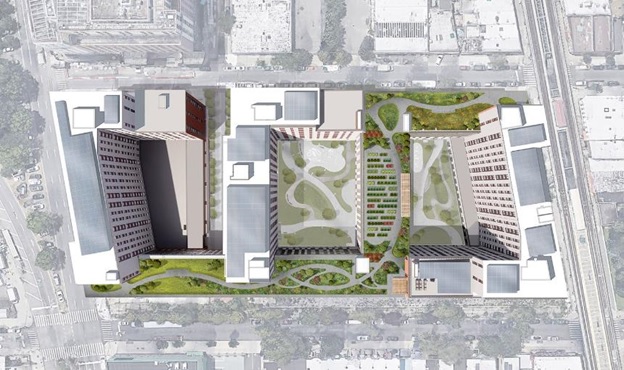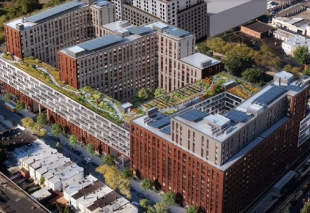 Turning this edifice into an architectural masterpiece has been no small feat. Designed by Dattner Architects and developed by Phipps Houses, the 14-story Atlantic Chestnut building spans an entire city block, encompassing 4.5 acres with 3 interconnected, mixed-use buildings. One of the most prominent features of this spectacle is its "Rooftop Green Ribbon" terrace which links the three buildings at the ninth-floor roof featuring a walking path that runs from end to end, with a full 2-way loop representing a ¼ mile walk.