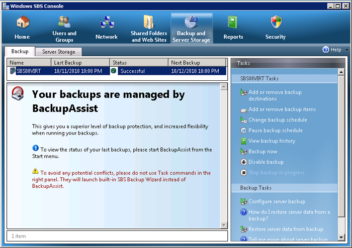 SBS Performance Report Integration is enabled as part of the normal BackupAssist installation and setup process - no special configuration is required. After installing BackupAssist v6.2.4 or later, upon accessing the Backup and Server Storage section of the Microsoft Windows SBS Console, users will see a message indicating that BackupAssist is managing backups on your system.