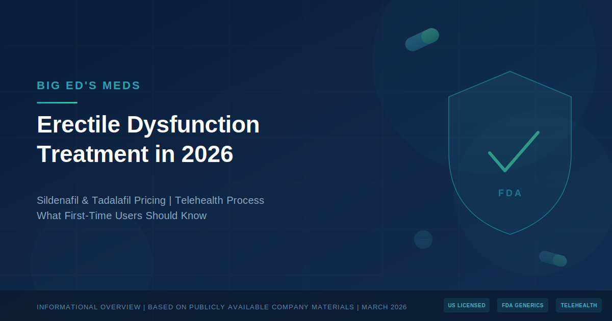 This informational overview examines publicly available Big Ed's Meds materials related to erectile dysfunction treatment, including the sildenafil and tadalafil options listed on the platform, current pricing tiers, the telehealth consultation process, and key policy details that first-time users may want to understand before getting started. According to the company's published materials, licensed healthcare providers review submitted health information and determine whether treatment is appropriate. Not every consultation results in a prescription.