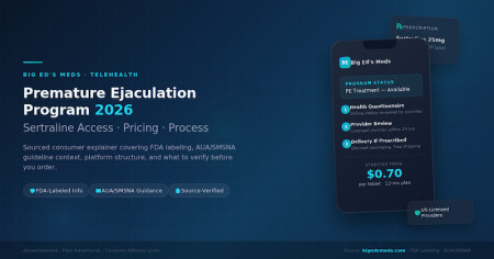 That dynamic is part of why telehealth platforms have moved into this space. Big Ed's Meds, a US-based telemedicine service operated by Big Eds Meds LLC out of Johnston, Iowa, now lists a dedicated PE treatment pathway on its website. The platform also offers treatments for other conditions, including FDA-approved generic medications for men's health concerns. The medication listed for PE is Sertraline, an FDA-approved prescription SSRI that is not specifically approved for PE but is discussed in AUA/SMSNA guidance as one of the daily SSRIs used off-label in clinical practice for this condition.