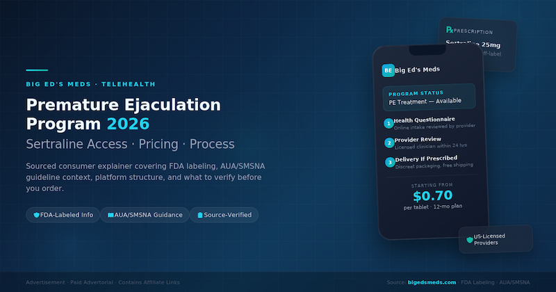 Big Ed's Meds Premature Ejaculation Program in 2026: Sertraline Pricing, Telehealth Process, FDA and AUA/SMSNA Context, and What to Verify Before You Order