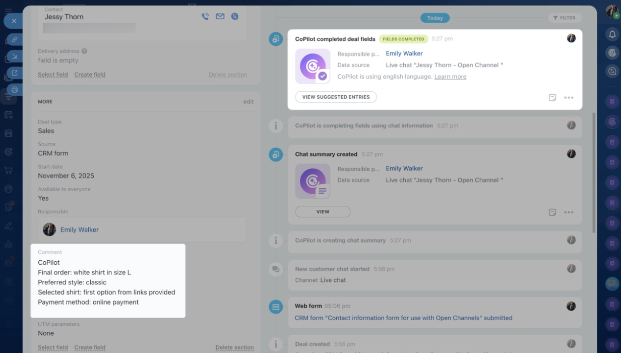 Using CoPilot is simple. Select a chat in the CRM timeline and click the CoPilot button. The AI summarizes the conversation and fills in the form with relevant details in seconds.
