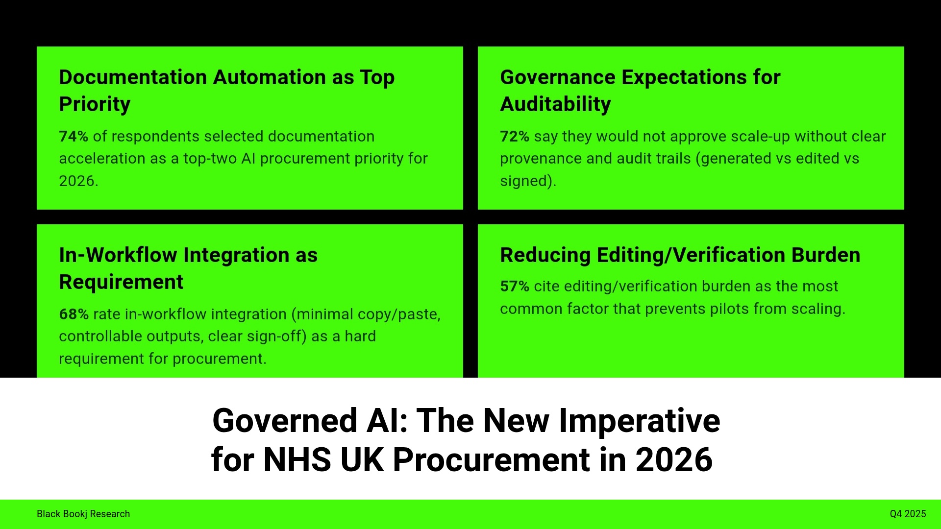 CITY OF LONDON, England, December 22, 2025 (Newswire.com) - Black Book Research today released findings from its NHS UK AI Procurement Readiness Poll. capturing perspectives from NHS provider and system digital leaders responsible for AI evaluation, clinical safety, information governance, and procurement oversight. Respondents indicate that 2026 NHS AI purchasing decisions will be determined less by pilot velocity and feature breadth, and more by whether solutions are deployable under governance, meaning they can be implemented safely inside clinical workflows, audited end-to-end, monitored post-deployment, and updated under controlled change management.
