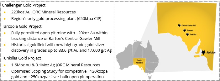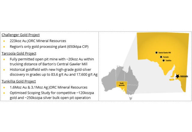 Barton Gold is an ASX, OTCQB and Frankfurt Stock Exchange listed Australian gold developer targeting future gold production of 150,000ozpa with 1.9Moz Au & 3.1Moz Ag JORC Mineral Resources (73.0Mt @ 0.79 g/t Au), brownfield mines, and 100% ownership of the region's only gold mill in the renowned Gawler Craton of South Australia.*