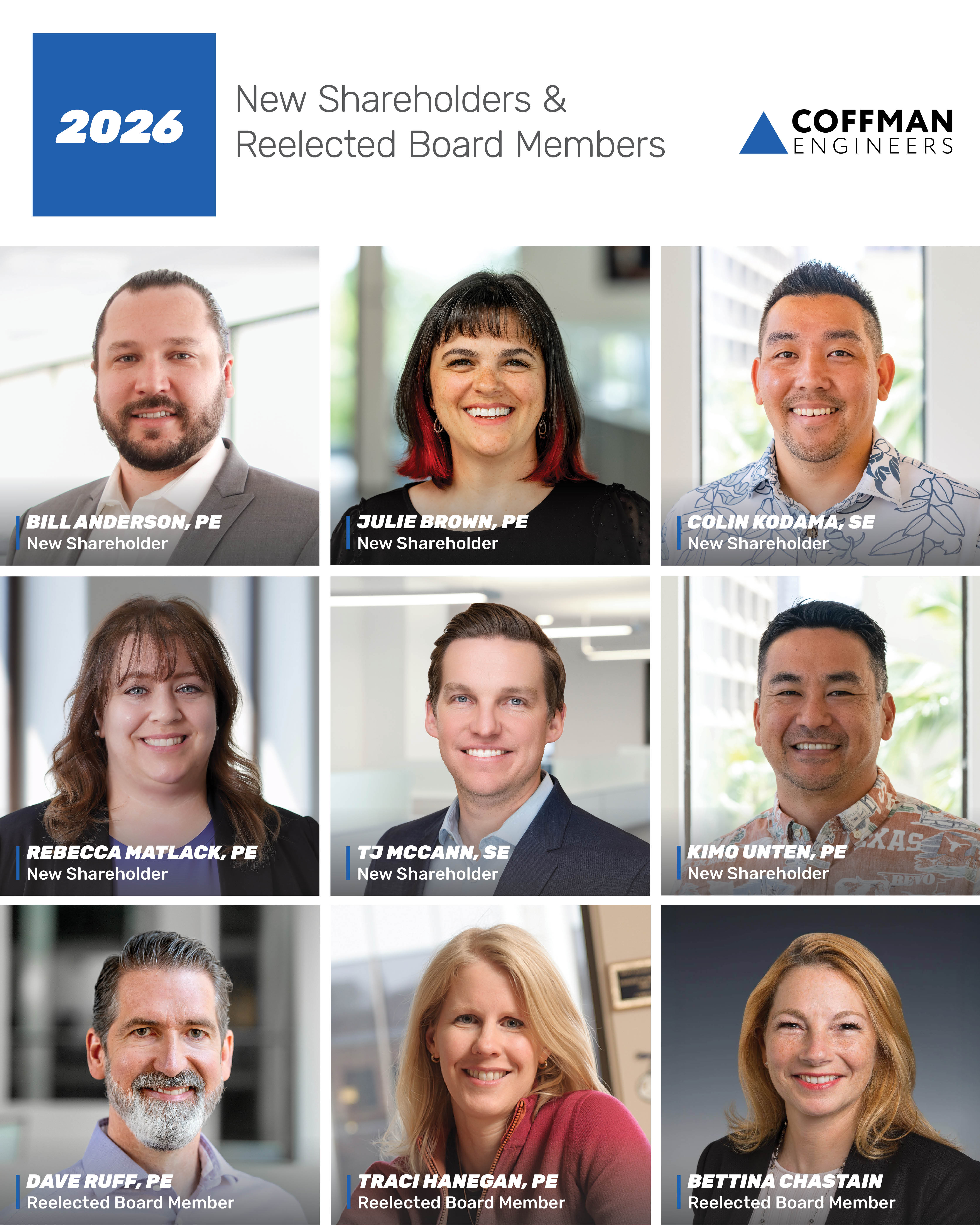 Summary: Coffman Engineers announced the reelection of three Board Directors and the addition of six new shareholders, reinforcing leadership continuity and long-term firm ownership.