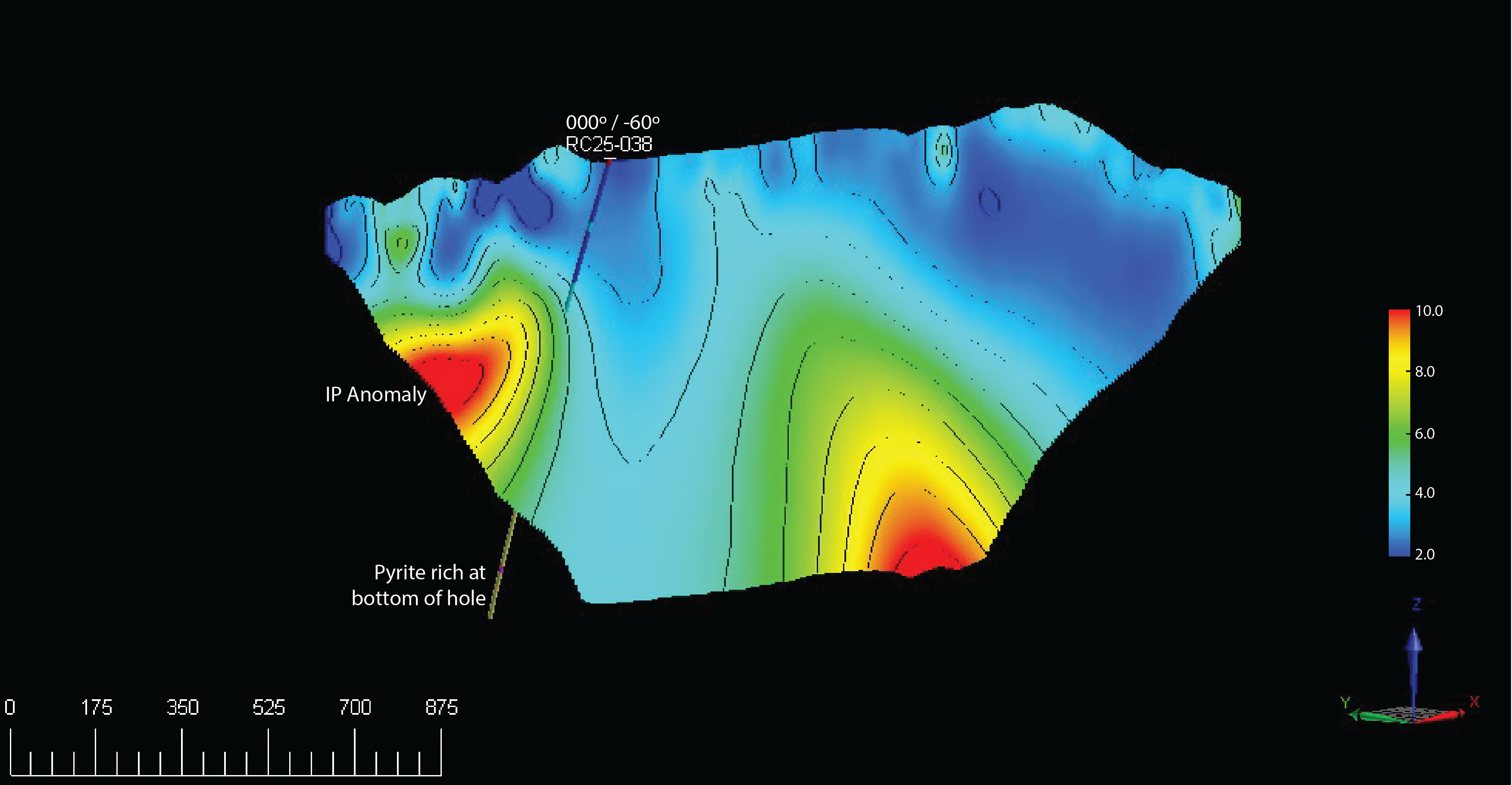 Figure 5: REE drill hole RC25-038 in relation to IP chargeability anomaly. The hole was drilled true north and just grazed the edge of Target 1. There were pyrite rich zones at the bottom of hole, proximal to Target 1.