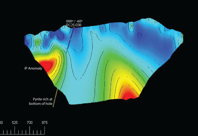 Figure 2: East-West IP chargeability cross section showing hole RC25-038, drilled true north into the section.