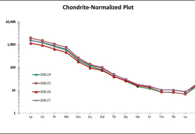 Laboratory analysis of the samples shows a geochemical fingerprint that points clearly to a deep, mantle-sourced carbonatite system. Chondrite-normalized REE plots show a smooth lanthanide distribution profile with no negative europium anomaly. This pattern is characteristic of mantle-derived alkaline magmatic systems and matches the REE signature of the Mountain Pass carbonatite. The absence of a negative europium anomaly is consistent with a deep mantle-derived REE system. This profile is exactly the profile that would be expected on the margins of a carbonatite body.