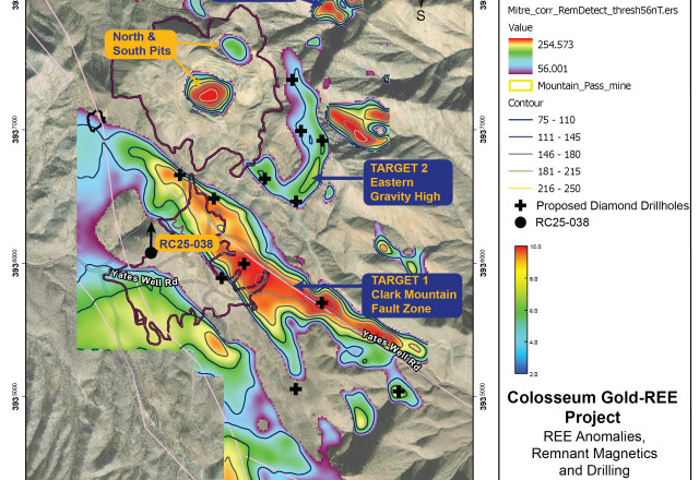 Drill hole RC25-038 represents the first drill intersection of anomalous rare earth element at the Colosseum Project and was specifically designed to test early indications of REE prospectivity using broad-based geophysical (MT) targeting. The hole was collared at the contact of the Clark Mountain Fault in an area with no exposed fenite alteration at surface, demonstrating that anomalous REE is present in the subsurface beyond previously mapped alteration zones.