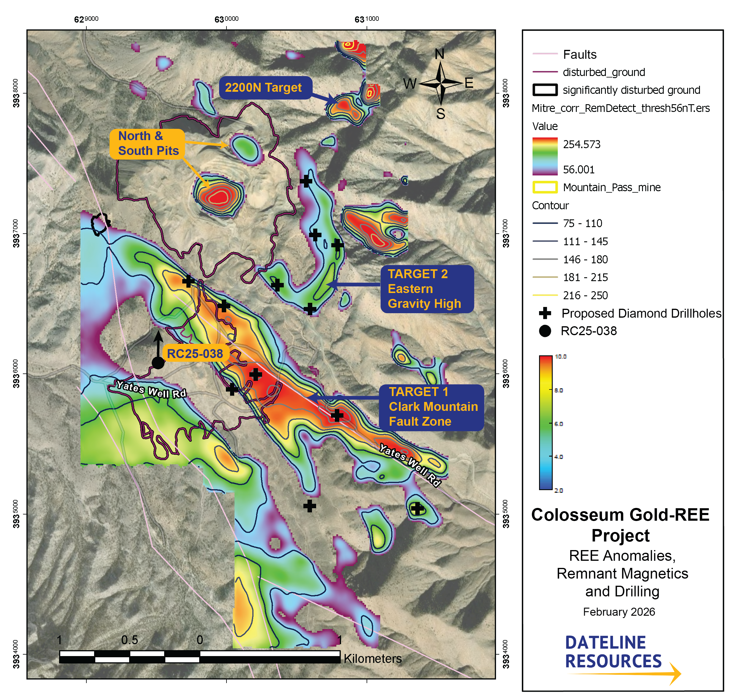 SAN BERNARDINO, Calif., February 25, 2026 (Newswire.com) - Dateline Resources Limited (ASX:DTR)(OTCQB:DTREF)(FSE:YE1) (Dateline or the Company) is pleased to report on the interpretation of the Company's high-resolution geophysical datasets collected across the Colosseum Project. Gravity, high-resolution airborne magnetics and radiometrics, induced polarization (IP) and magneto-tellurics (MT) were interpreted with geological mapping and surface geochemistry data to identify carbonatite rare earth targets. Three distinct targets demonstrate coincident anomalies that would be expected from a carbonatite source. Two of the targets are defined sufficiently for a diamond drill program.