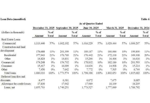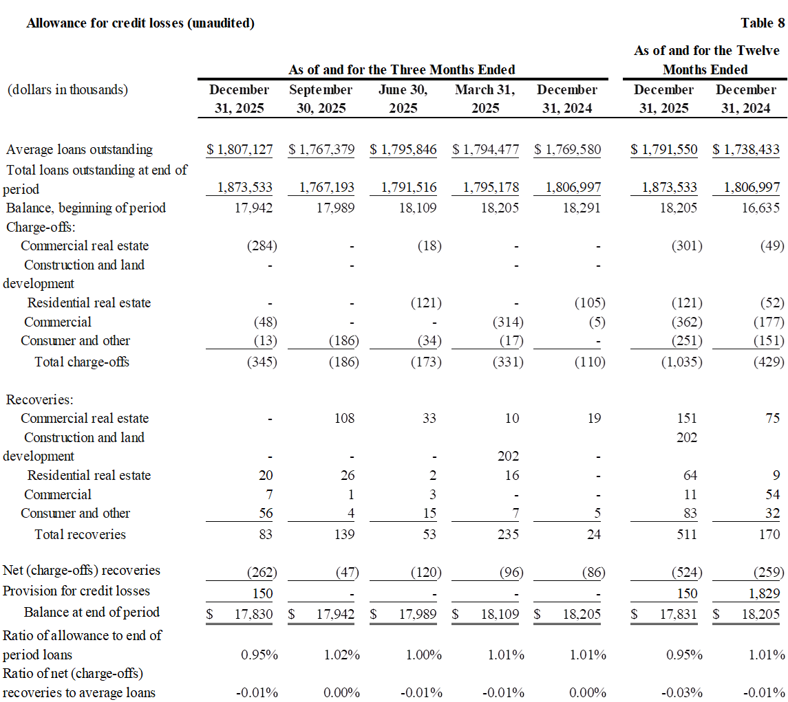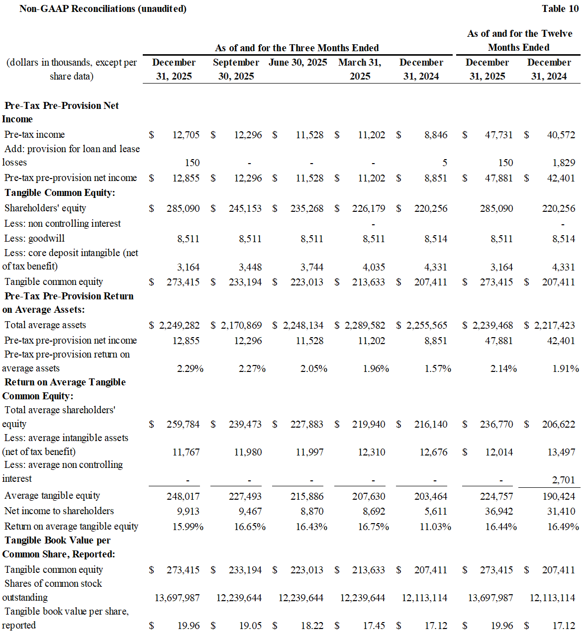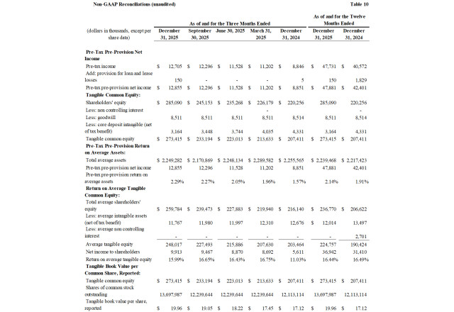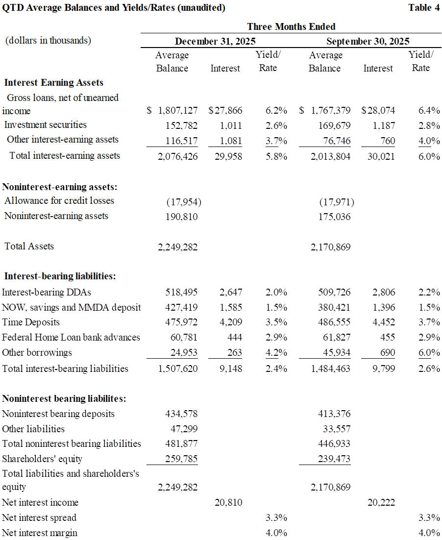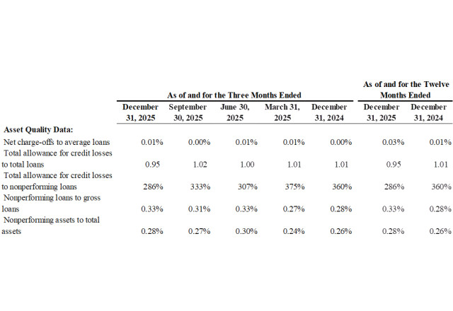 Book value per share increased $0.78, or 16% annualized, to $20.81 and tangible book value per increased $0.91, or 19% annualized, to $19.96 at December 31, 2025 from the third quarter of 2025