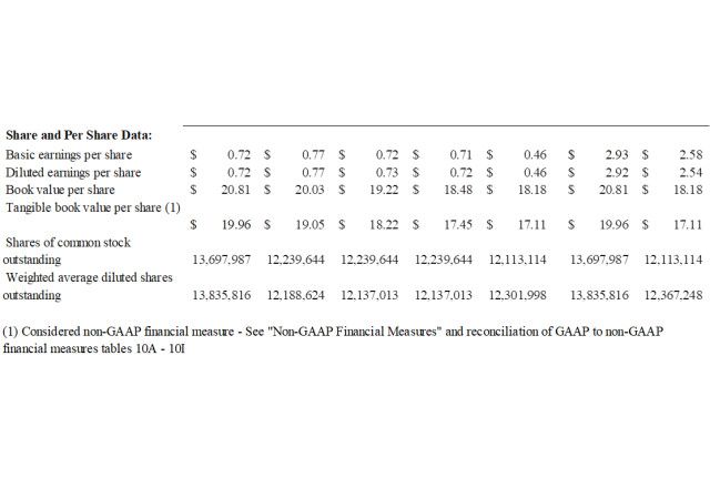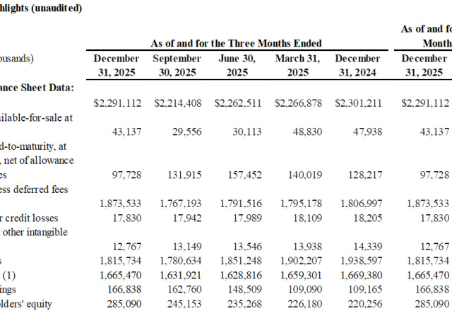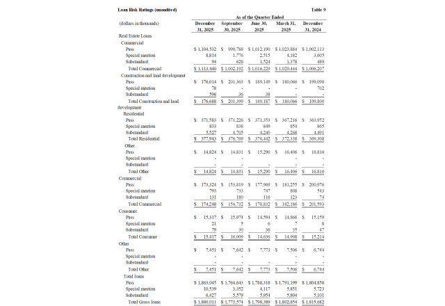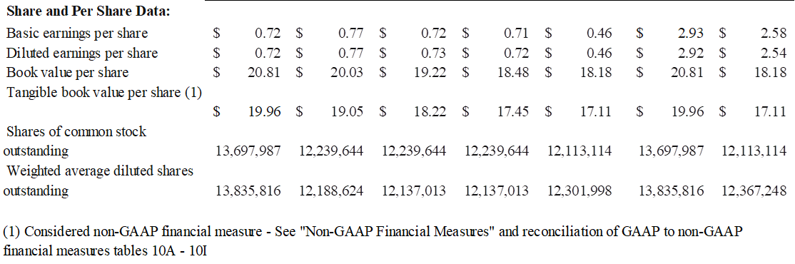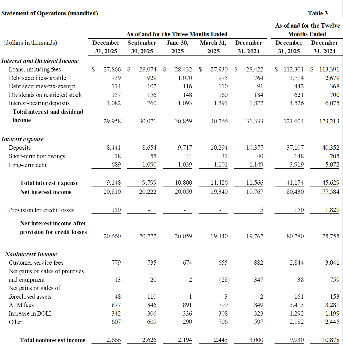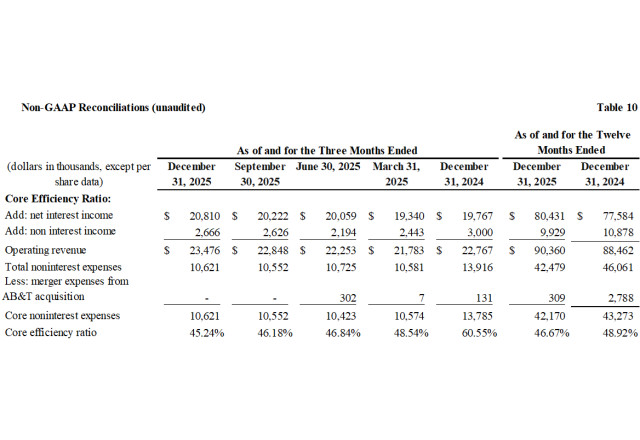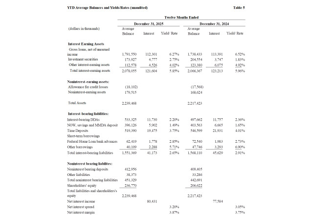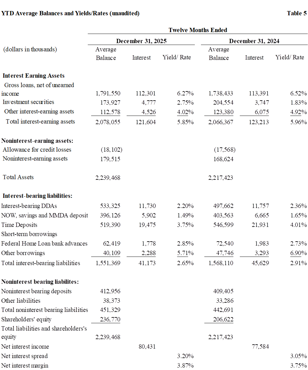 Book value per share increased $0.78, or 16% annualized, to $20.81 and tangible book value per increased $0.91, or 19% annualized, to $19.96 at December 31, 2025 from the third quarter of 2025