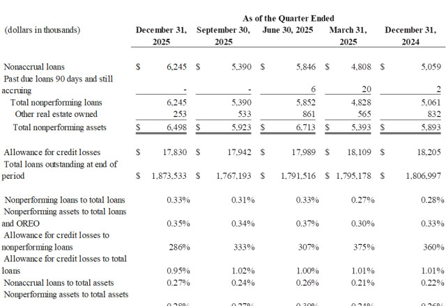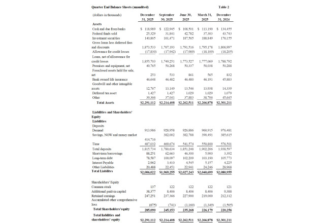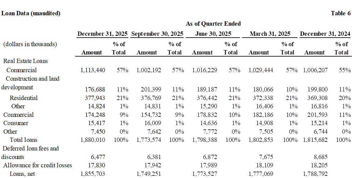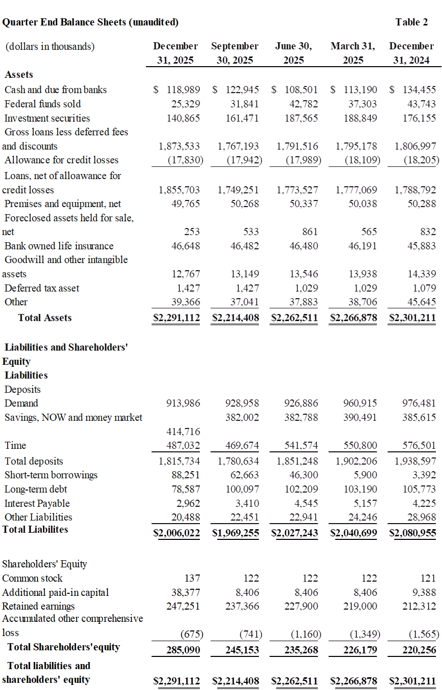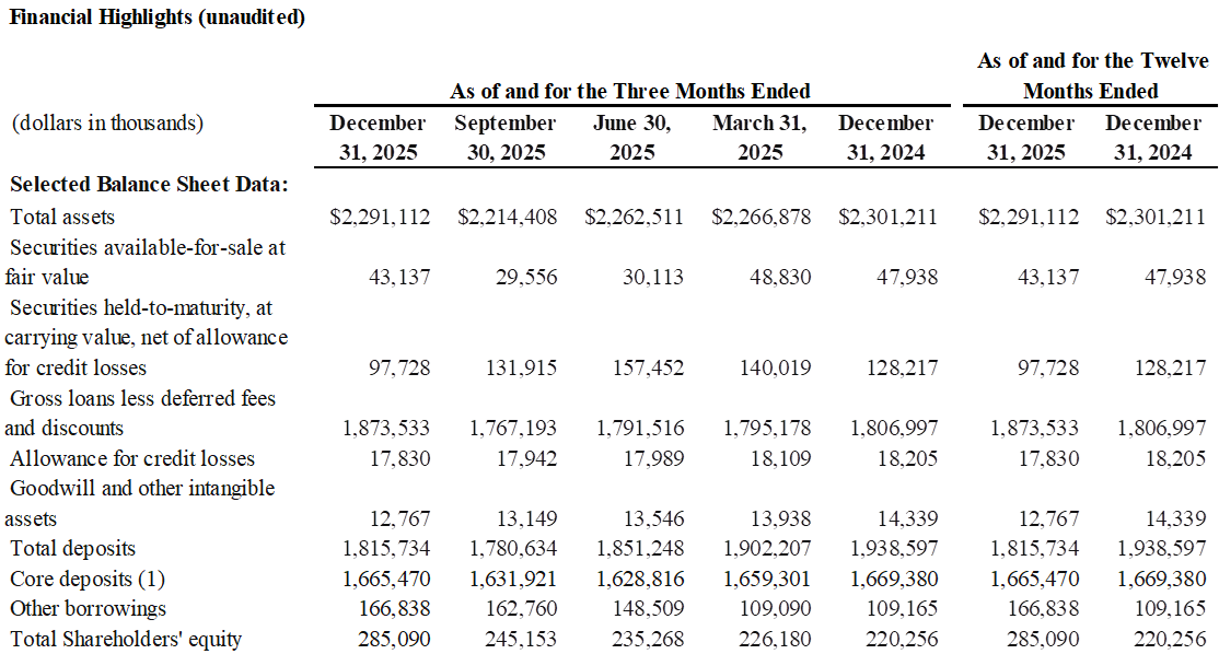 Total assets were $2.3 billion as of December 31, 2025, compared to $2.3 billion as of December 31, 2024. This was primarily due to a decrease in the loan portfolio during the first three quarters of the year offset by loan growth during the fourth quarter.