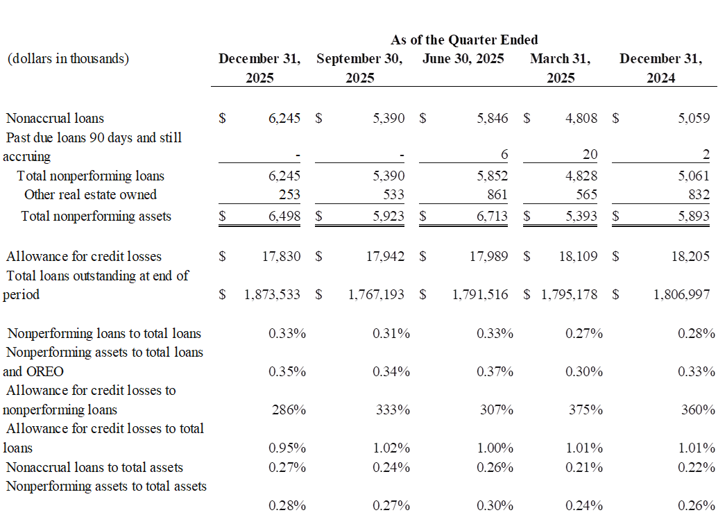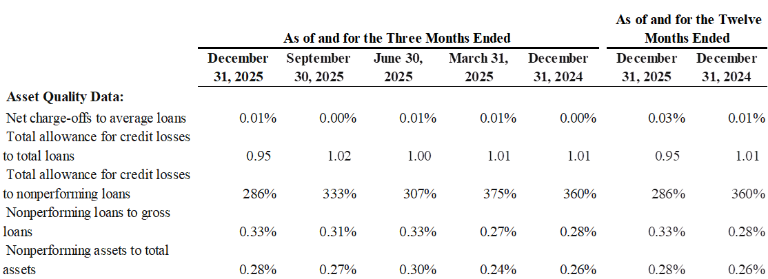 Asset quality decreased slightly with nonperforming assets to total assets of .28% as of December 31, 2025 and compared to .26% as of December 31, 2024. The allowance for credit losses to total loans decreased slightly to 0.95% as of December 31, 2025 from 1.00% as of December 31, 2014.