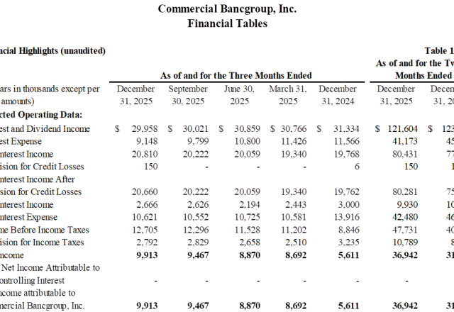 Commercial Bancgroup, Inc. Announces Results for the Fourth Quarter 2025