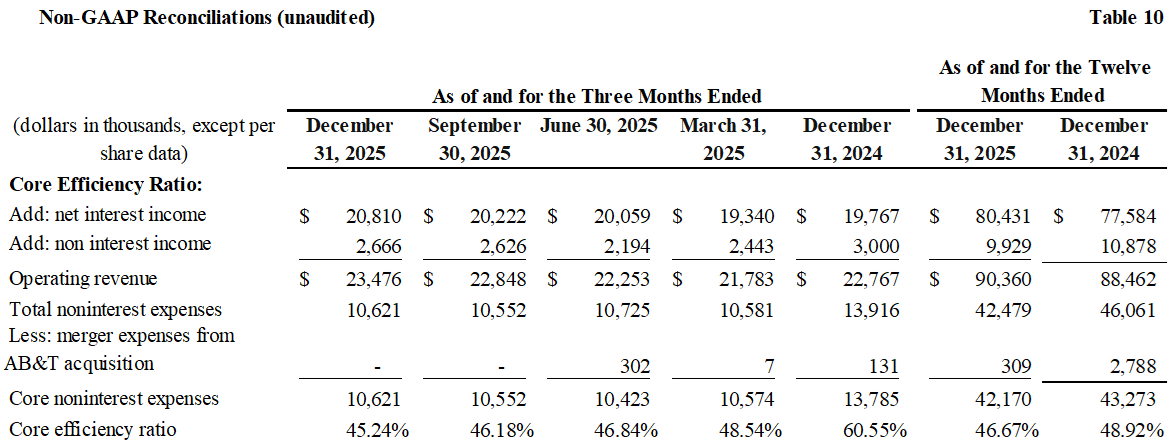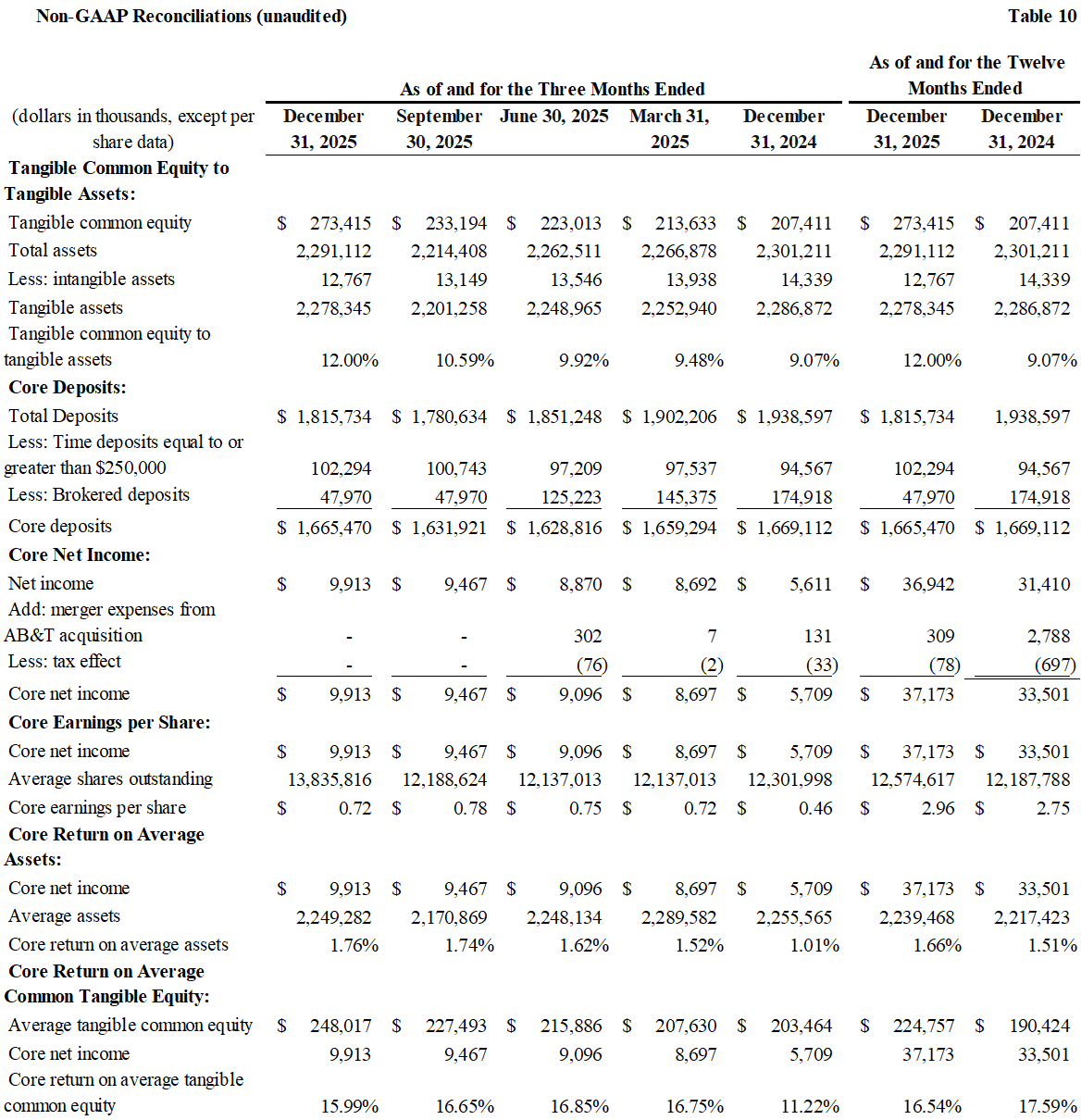Tangible book value per share of $19.96 per share as of December 31, 2025, compared to $17.11 per share as of December 31, 2024 (see non-GAAP reconciliation).