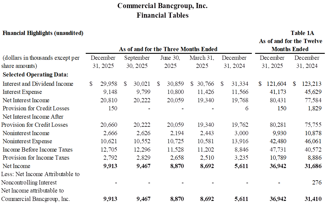 HARROGATE, Tenn., January 26, 2026 (Newswire.com) - Commercial Bancgroup, Inc. ("Commercial" or the "Company") (Nasdaq:CBK), the parent company of Commercial Bank (the "Bank"), today announced net income less non-controlling interest of $9.9 million, or $0.72 per diluted common share, for the fourth quarter of 2025, compared to net income less non-controlling interest of $5.6 million, or $0.46 per diluted common share, for the fourth quarter of 2024.