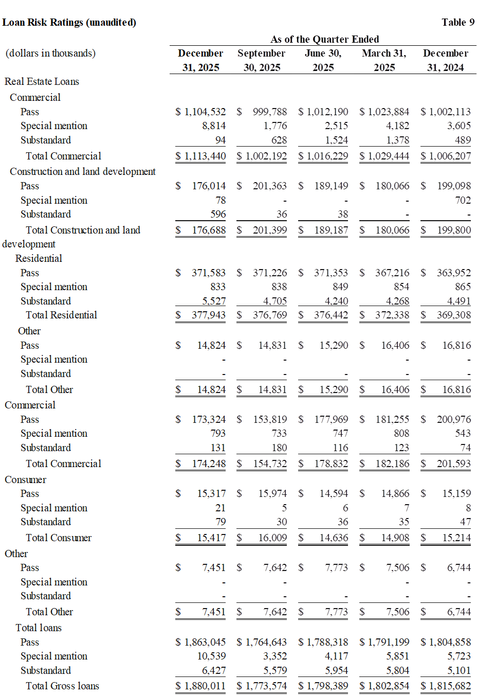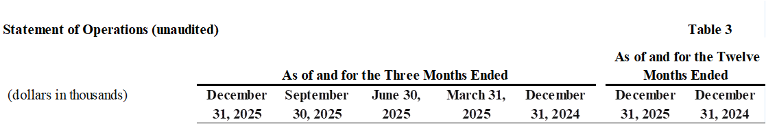 (dollars in thousands) | December 31, 2025 | September 30, 2025 | June 30, 2025 | March 31, 2025 | December 31, 2024 | December 31, 2025 | December 31, 2024 | |||||||||||||||||||||