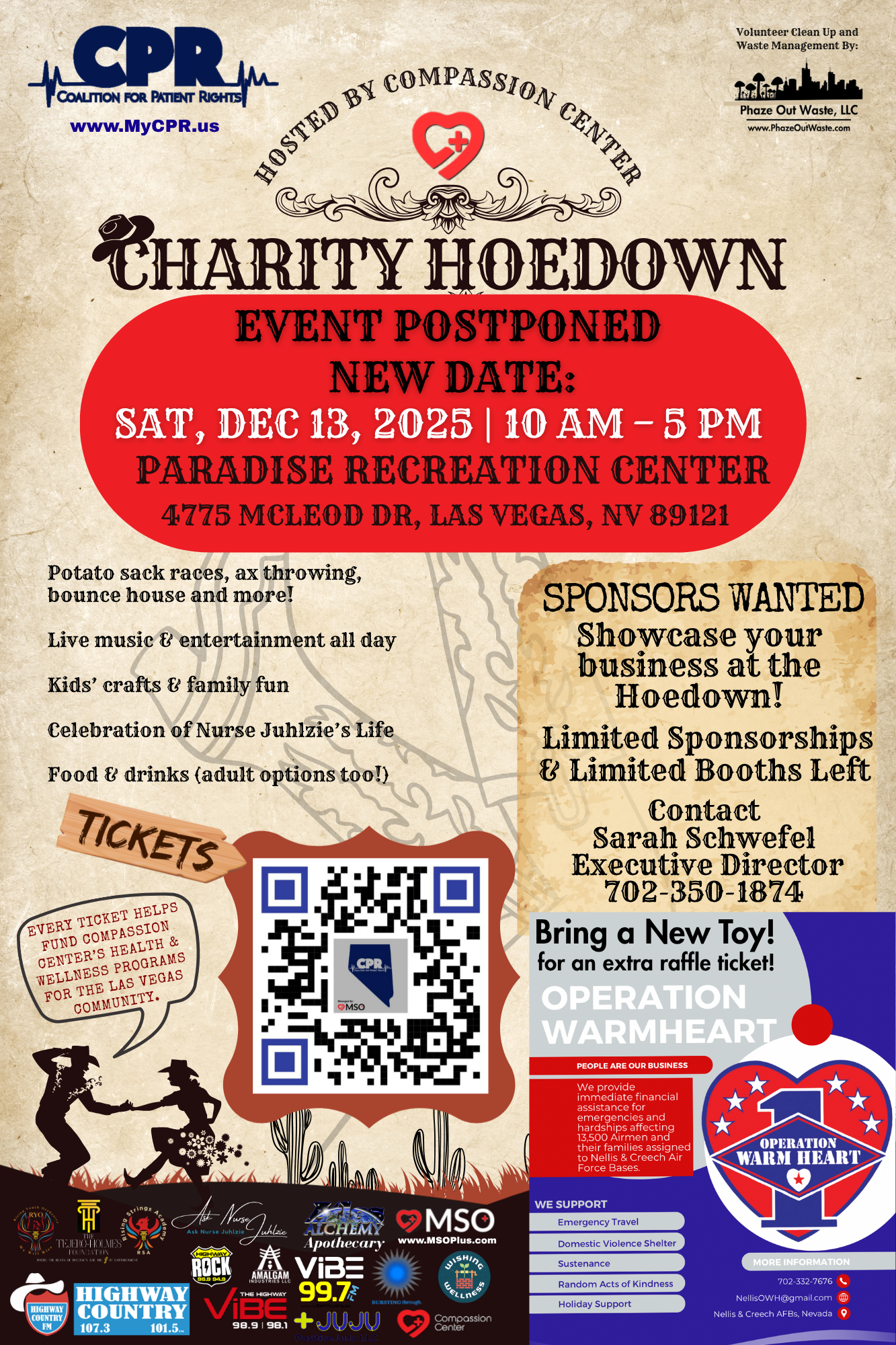Given these recent developments, and the fact that Julie would not miss being part of the Compassion Center's Coalition for Patient Rights Charity Hoedown that's now being held on December 13th, 2025, at Paradise Recreation Center, 4775 McLeod Dr, Las Vegas, NV 89121, from 10 a.m. to dusk, Nurse Juhlzie will continue to unite the local Las Vegas community-this time around a toy drive for Operation Warm Heart (Nellis and Creech AFB's) and a traditional hoedown where the community will dance, vibe, play, and enjoy a celebration of Nurse Juhlzie and her storied life just like Julie would have liked.