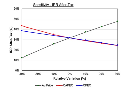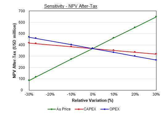 The figures below illustrate the after-tax sensitivity analysis of the NPV5% to various key operating parameters and the gold price.