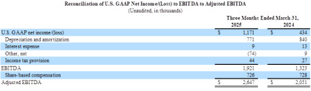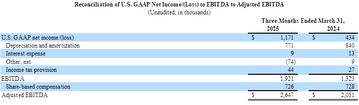 EBITDA and Adjusted EBITDA: EBITDA for the first quarter of 2025 of $1.9 million compared to $1.3 million for the first quarter of 2024. Adjusted EBITDA for the first quarter of 2025 of $2.6 million compared to $2.1 million for the first quarter of 2024.
